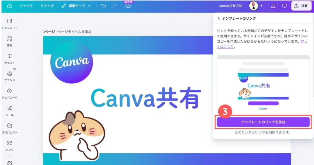 編集可のリンクは相手が直接デザインを編集できる設定です。