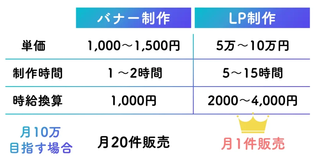 一方で、ランディングページ(LP)の場合、1件あたり5万〜10万円なので、月10万を目指すのであれば、月1件販売すればいい計算になりますね。