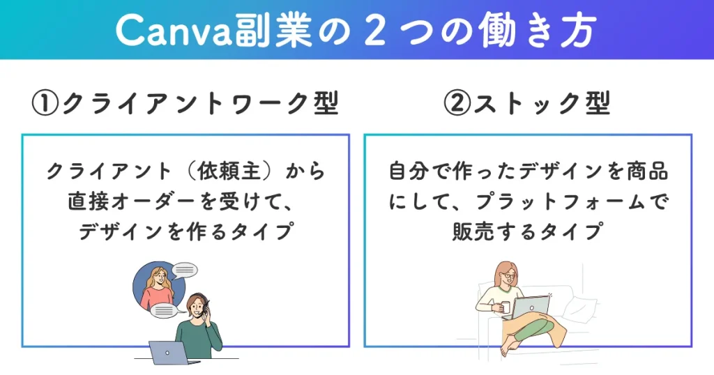 Canva副業には、大きく分けて「クライアントワーク型」と「ストック型」があります。