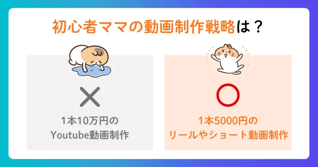 考え方としては、1本10万円のYouTube動画を何時間もかけて作るより、1本5,000円のリール・ショート動画をAIを使ってサクッと10本・20本作れるようになる方が、初心者ママには圧倒的に現実的で続けやすい、ということです。