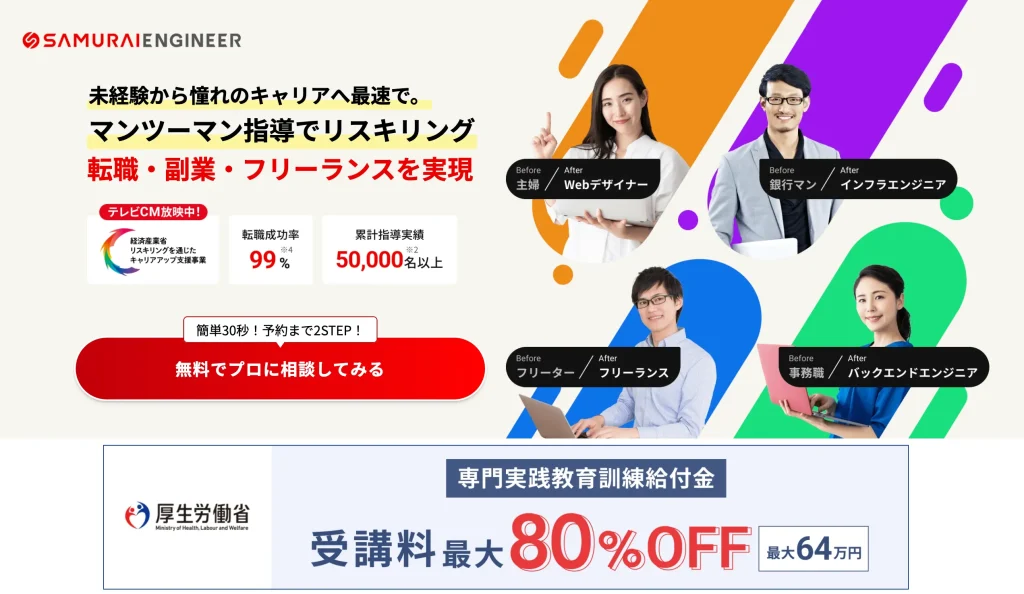 ただ、その分受講料が高くなりがちなのですが、侍エンジニアは、リスキリング補助金はもちろん、なんと教育訓練給付金の最大80%という最高水準の給付金が受けられる数少ないスクールですなので、