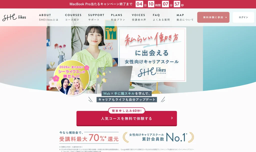 SHElikes(シーライクス)は、他のスクールと異なり、月額定額制(サブスク方式)で50職種のスキルが学び放題、身につけたいスキルを選べる女性に嬉しいデザインスクールです。
