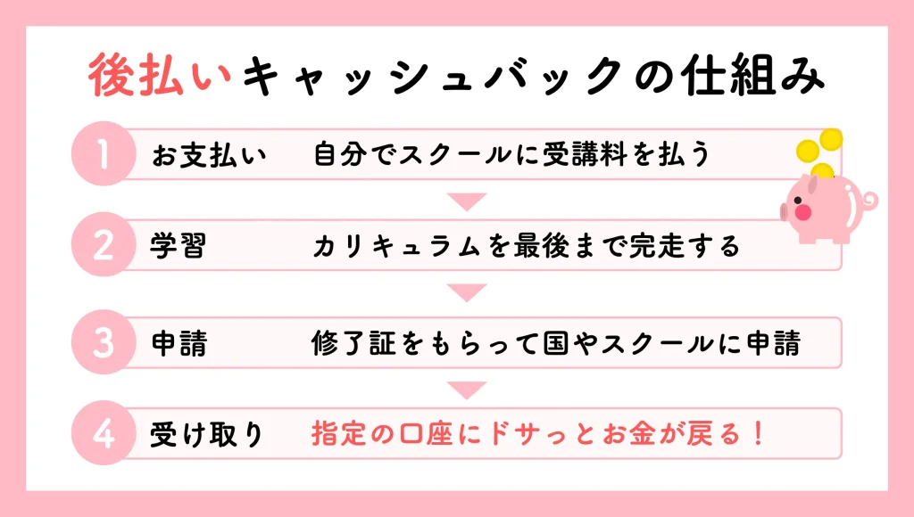 ⭕「一旦全額払って、修了後に戻ってくる」キャッシュバック方式です。