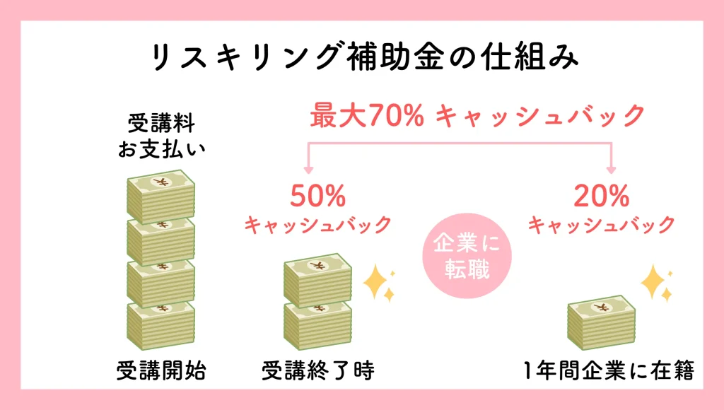 説明の通り、「リスキリング補助金は、まずは講座を完走した時点で受講料の50%が戻り、 学んだスキルを活かして転職し1年働くと+20%(合計70%)が加算される仕組みなので、ご注意ください!
