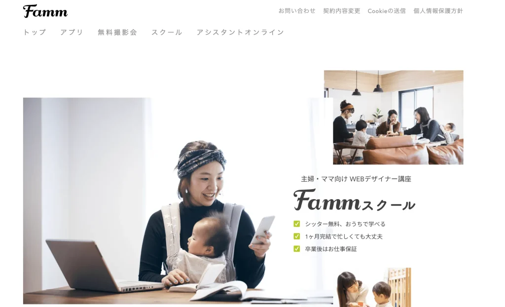 Famm(ファム)は他にはない「ベビーシッター付きのWebデザインスクール」で、期間も最短1ヶ月で卒業が可能です。