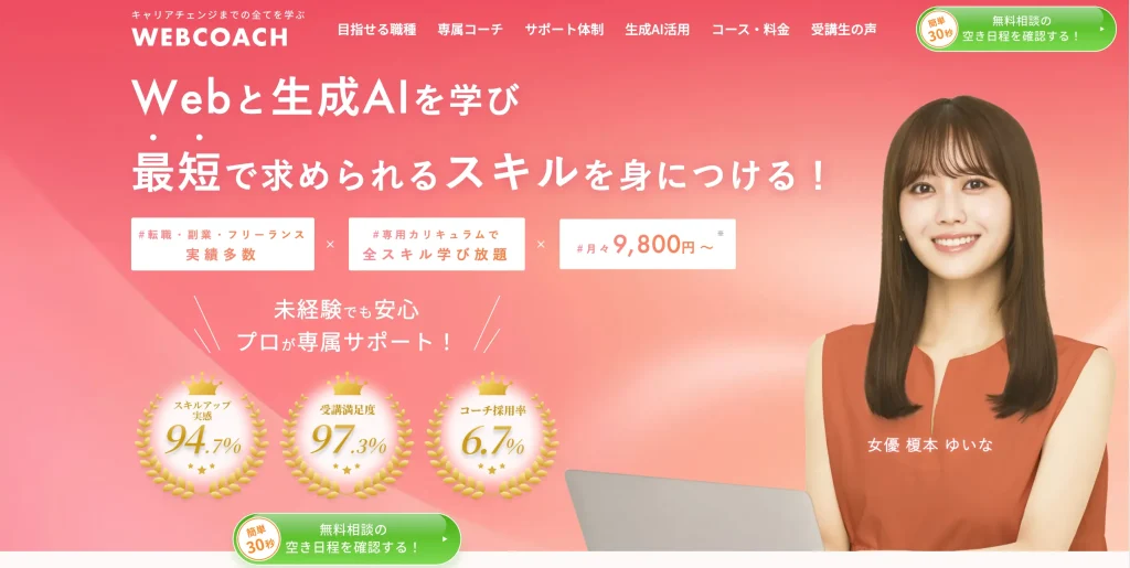 WEBCOACH(ウェブコーチ)は、Webデザインに関する知識はもちろん、営業術や提案スキルなど、キャリアチェンジに必要なスキルを“広く実践的に”学べる、完全マンツーマンのWEBスクールです。